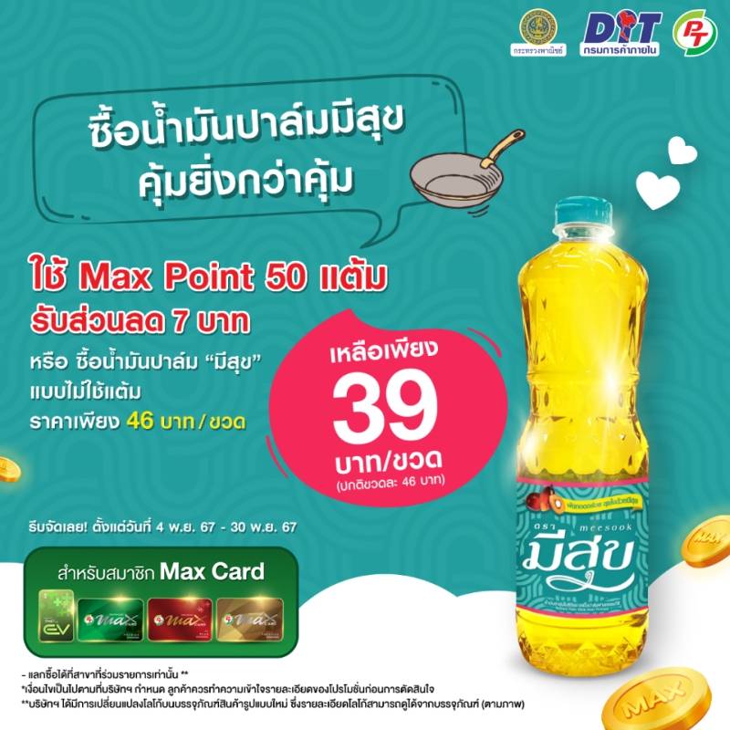 กรมการค้าภายใน กระทรวงพาณิชย์ และ บริษัท พีทีจี เอ็นเนอยี จำกัด (มหาชน) หรือ PTG ร่วมแบ่งเบาภาระค่าครองชีพให้กับคนไทยและลูกค้าสมาชิกผู้ถือบัตร Max Card ด้วยการจัดโปรโมชั่นตรึงราคาน้ำมันปาล์ม “มีสุข” ซื้อน้ำมันปาล์ม “มีสุข”คุ้มยิ่งกว่าคุ้ม ตั้งแต่วันที่ 4 พ.ย. 67 – 30 พ.ย. 67 เพื่อให้คนไทยได้มีความสุขไปกับทุกมื้ออาหาร และมีชีวิตที่อยู่ดีมีสุข