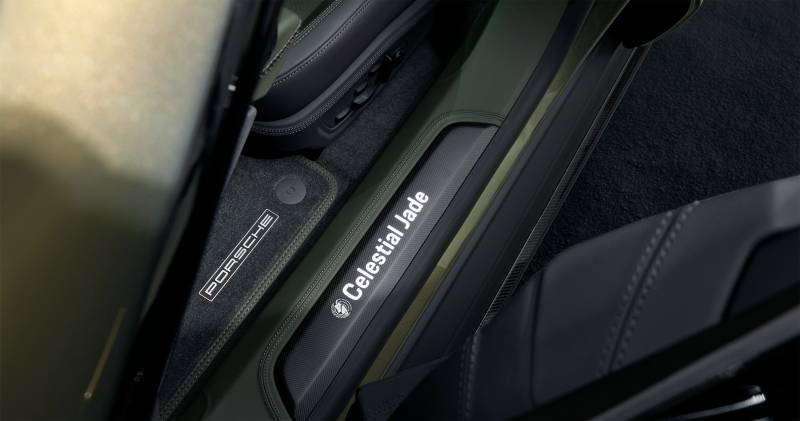 การผสมผสานของทั้ง 2 สีส่งผลให้เกิดชื่อที่เลิศล้ำของรถยนต์คือ “Celestial Jade” ซึ่งโดยเฉพาะในเอเชีย หยกเป็นอัญมณีอันล้ำค่าที่มีประวัติศาสตร์อันยาวนานและเกี่ยวข้องกับความสุขและความยั่งยืน ส่วนคาร์บอน “Carbon” เป็นสัญลักษณ์ของจิตวิญญาณแห่งการบุกเบิกของปอร์เช่ ซึ่งเป็นสีที่เป็นนวัตกรรมและทรงพลัง มักพบเห็นได้ในโลกของการแข่งรถ วัสดุนี้มีความแข็งแรง เบา และทนทาน