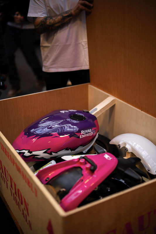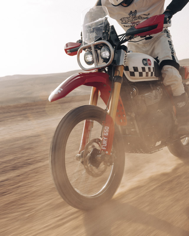 และรถคันสุดท้ายคือ FURY 650 สร้างสรรค์โดย Fuel แบรนด์ไลฟ์สไตล์จากบาร์เซโลนาที่โด่งดังจาก Scramblers และ Cafe Racers ที่เป็นเอกลักษณ์ Karles Vives ผู้ก่อตั้งและผู้อำนวยการฝ่ายสร้างสรรค์ของ Fuel Motorcycles ได้รับแรงบันดาลใจในการผลักดัน Royal Enfield Bear 650 ใหม่ ให้ถึงขีดจำกัดของศักยภาพ Off-Road ด้วยความหลงใหลในการผจญภัยที่เต็มเปี่ยม โปรเจกต์นี้เพื่อเป็นเกียรติแก่ Eddie Mulder แชมป์การแข่งขัน Big Bear Run ในตำนานปี 1960 และสร้างรถที่สามารถพิชิตทะเลทรายได้เหมือนกับรถที่ใช้แข่ง Baja 1000 ในยุค 90s สมรรถนะคือสิ่งสำคัญสูงสุด โดยเฉพาะอย่างยิ่งในสภาพ Off-Road ทำให้ Fuel อัปเกรดส่วนสำคัญต่างๆ เช่น ล้อหน้าขนาด 21 นิ้ว, ระบบกันสะเทือนที่ระยะยุบยาวขึ้น, ระบบนำทาง และไฟหน้าคู่FURY 650 ใช้ Royal Enfield Bear 650 เป็นพื้นฐาน ล้อหน้าเปลี่ยนเป็น 21 นิ้ว พร้อมยาง Mitas Dakar 6 ส่วนล้อหลัง 17 นิ้ว
