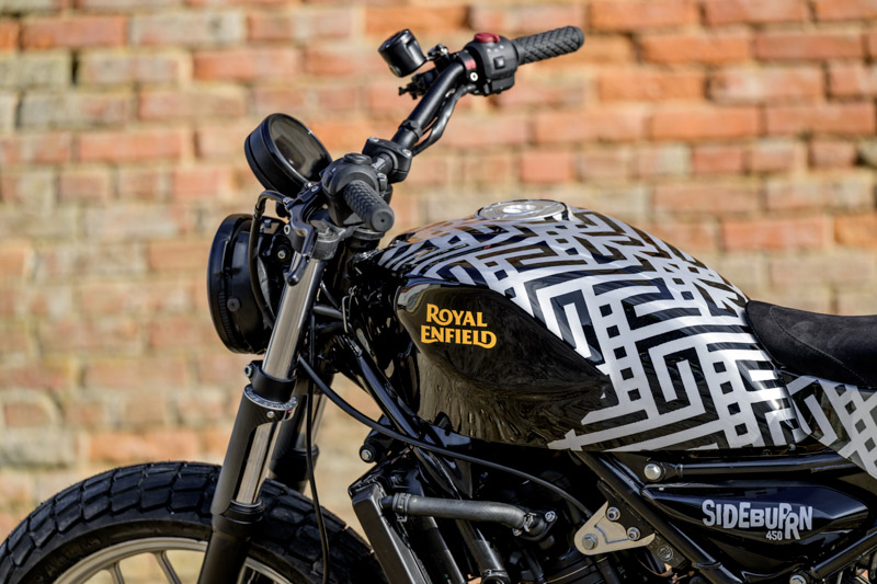 ชื่อ “Modern Primitive” มาจากหนังสือที่มีอิทธิพลอย่างมากเกี่ยวกับรอยสักและการดัดแปลงร่างกายในยุค 1980s คำว่า Modern สื่อถึง Royal Enfield Guerrilla 450 ที่เป็นรถรุ่นใหม่ ส่วนคำว่า Primitive สื่อถึงการปรับโฉมให้เป็น Street Tracker ที่เรียบง่ายและแสดงออกถึงแก่นแท้ของรถมอเตอร์ไซค์มากยิ่งขึ้น ตัวถังและท้ายอะลูมิเนียมที่สร้างขึ้นใหม่โดย Coba Valley Cycles พร้อมงานเพ้นท์อันเป็นเอกลักษณ์ และเบาะหนัง Alcantara จาก Holy Goat ที่ทำให้รถคันนี้ดูดิบแต่ก็มีสไตล์อย่างไม่น่าเชื่อ