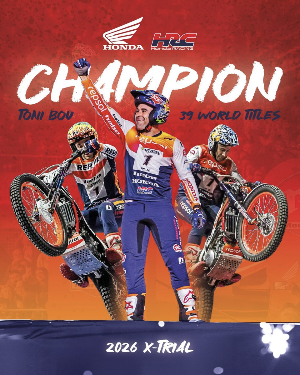 Repsol Honda HRC ตอกย้ำผลงานสุดเหนือชั้นในการแข่งขันศึก X-Trial World Championship 2026 ด้วยแชมป์โลกสมัยที่ 20 ของ “โทนี่ โบ” พร้อมลุ้นกวาดอันดับที่ 1 และ 2 ของโลกใน 2 การแข่งขันช่วงโค้งสุดท้ายของฤดูกาลจากผลงานของ “กาเบียล มาเซลลี่” ขณะที่ “โบ” กวดแชมป์โลกไปครองรวมแล้วถึง 39 สมัย