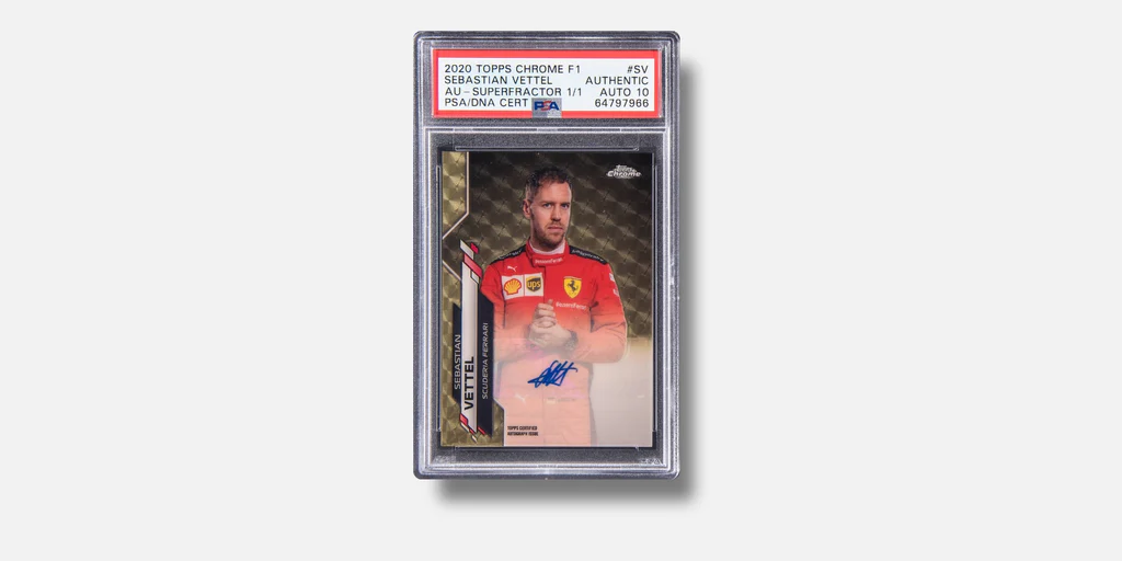 Topps Chrome F1 SuperFractor อันน่าทึ่งใบนี้ ประดับด้วยเซบาสเตียน เวทเทล หนึ่งในนักแข่งฟอร์มูล่าวันที่มีชื่อเสียงที่สุด การ์ดใบนี้ลงนามด้วยลายเซ็นขนาด 1/1 และได้รับการจัดระดับ PSA 10 อย่างสมบูรณ์แบบ แสดงให้เห็นถึงการผสมผสานที่หาได้ยากระหว่างความเกี่ยวข้องทางประวัติศาสตร์และสภาพที่สมบูรณ์แบบ สำหรับนักสะสมที่มองหาการ์ด F1 สุดพิเศษที่เชื่อมโยงกับตำนาน นี่คืออัญมณีล้ำค่า