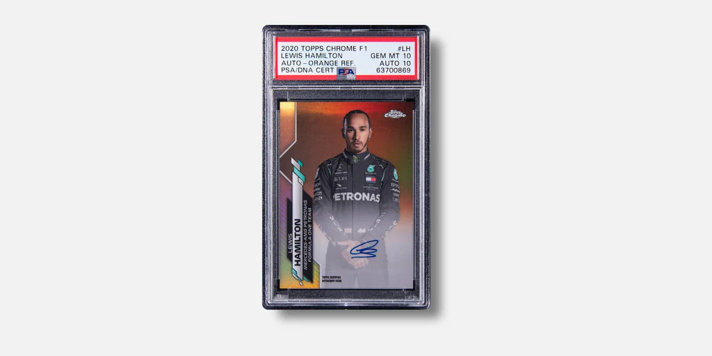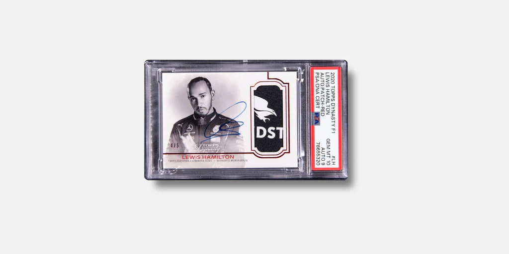 การ์ด Topps Dynasty F1 Red Patch Auto ของ Lewis Hamilton ใบนี้มีเพียง 5 ใบในโลกเท่านั้น และเกรด PSA 10 การ์ดใบนี้มีสภาพไร้ที่ติเข้ากับความหายากของการพิมพ์ที่ต่ำ การ์ดสะสม Formula 1 แบบนี้คือเหตุผลที่นักสะสมต่างหลงใหลในการ์ด Topps F1 ไม่ว่าจะเป็นดีไซน์ที่เฉียบคม นักแข่งระดับแนวหน้า และความหายากที่หาได้ยาก