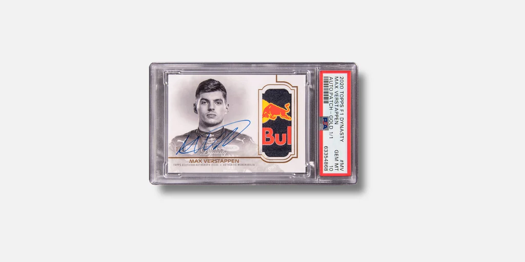 การ์ดลายเซ็นแพทช์สีทองสำหรับนักแข่งหน้าใหม่รุ่นพิเศษจาก Topps F1 Dynasty นี้ได้บันทึกภาพ Max Verstappen ขณะกำลังทะยานขึ้นสู่จุดสูงสุดของกริดสตาร์ท ด้วยแชมป์โลกหลายสมัยและสไตล์การขับขี่ที่ดุดัน ได้กลายเป็นโฉมหน้าของนักแข่งรุ่นใหม่ในวงการ F1 และการ์ดใบนี้มาพร้อมกับลายเซ็นกับแพทช์สีทองที่มีเพียงแค่ 1 ใบในโลกและได้รับเกรด PSA 10 ถือเป็นการ์ดที่สมบูรณ์แบบสำหรับแฟนๆ และเหล่านักสะสม