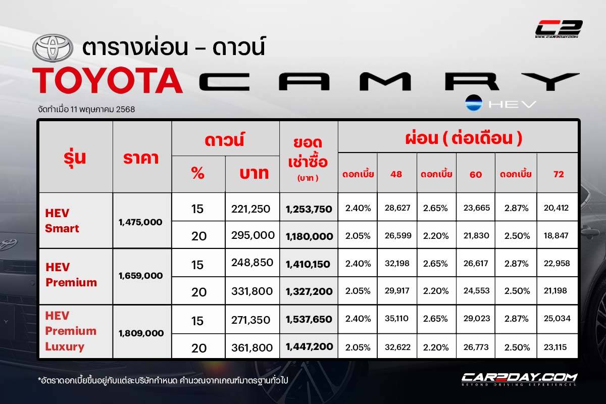 ตารางผ่อน – ดาวน์ Toyota Camry HEV ผ่อนเริ่มต้น 18,xxx บ.