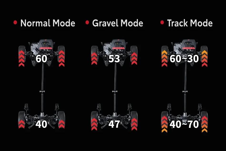 ระบบขับเคลื่อน 4 ล้อ GR-Four เลือกโหมดการขับขี่ได้ 3 รูปแบบคือ สามารถเลือกโหมดการทำงานให้เหมาะสมกับสภาพถนนและสไตล์การขับขี่ได้ ที่แยกแรงบิดระหว่างล้อหน้าและล้อหลัง คือ Normal (60/40) Sport (30/70) และ Track (50/50) เพื่อช่วยให้การทรงตัวและยึดเกาะได้อย่างมั่นคงในทุกสภาพถนน แม้ขณะเข้าโค้งด้วยความเร็วสูง ให้สมรรถนะที่ดีเยี่ยม พร้อม Torsen® LSD (Limited Slip Differential) กระจายแรงบิดระหว่างล้อคู่หน้าและหลังให้สัมพันธ์กับสถานการณ์การขับขี่โดยอัตโนมัติ ช่วยให้ตัวรถมีความสมดุลตลอดเวลา บังคับควบคุมได้ง่าย
