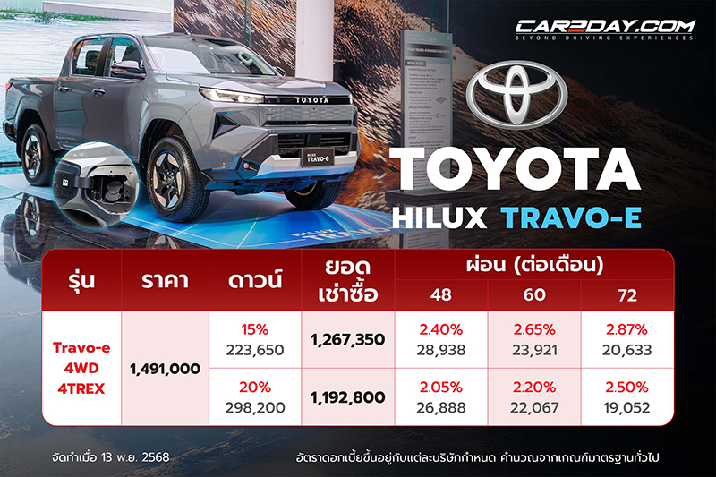 ตารางผ่อน ดาวน์ Toyota Hilux Travo-e กระบะไฟฟ้าล้วน ผ่อนเริ่มต้น 19,xxx บ.
