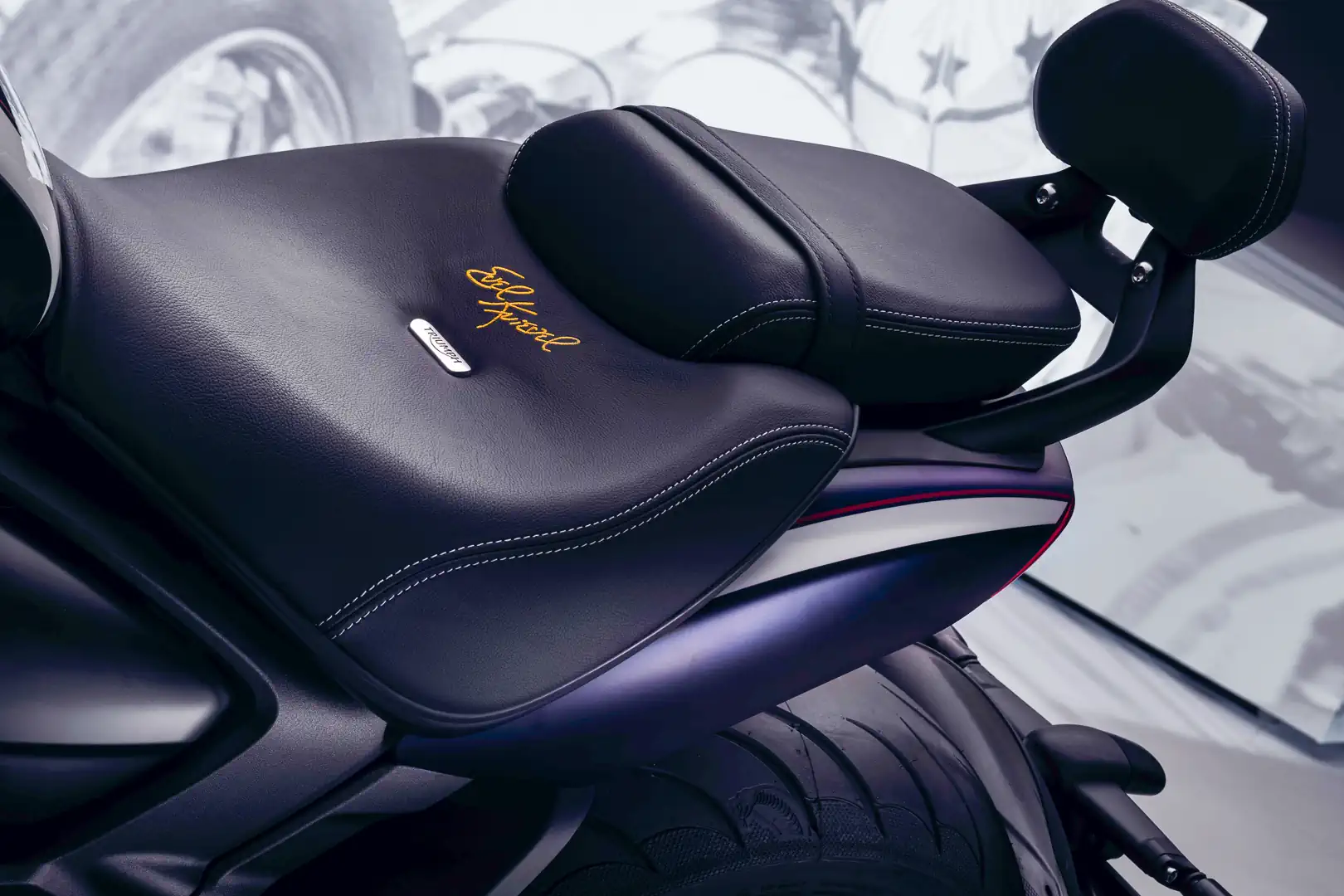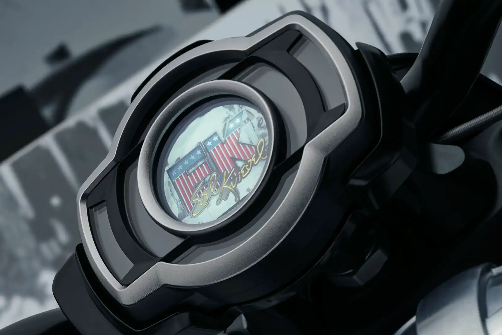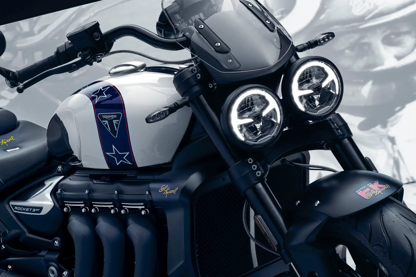 Rocket 3 Evel Knievel Limited Editions โดดเด่นด้วยถังเชื้อเพลิง โครเมียมสวยงามน่าทึ่ง ประดับด้วยรูปดาวและกราฟิกอันเป็นเอกลักษณ์ของ Knievel บนถังน้ำมันสีขาวเฉียบคม ตัวถังด้านหลังรับเข้ากันกับแผงสีดําา Matt Sapphire และเบาะนั่งหุ้มหนัง พร้อมโลโก้ลายเซ็น Evel Knievel ปักสีทอง ช่วยสร้างภาพลักษณ์ ที่โดดเด่น นอกจากนี้ยังได้เพิ่ม แอนิเมชั่นหน้าจอเริ่มต้นพิเศษช่วยเน้นย้ําสถานะที่เป็นเอกลักษณ์ของรถจักรยานยนต์ที่แกะสลักด้วยเลเซอร์ ได้รับการรังสรรค์ขึ้นอย่างพิถีพิถันเพื่อเฉลิมฉลองมรดกของ Knievel