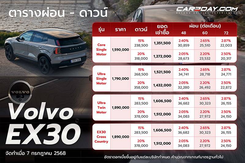 ตารางผ่อน ดาวน์ Volvo EX30 จัดทำเมื่อ 7 กรกฎาคม 2568